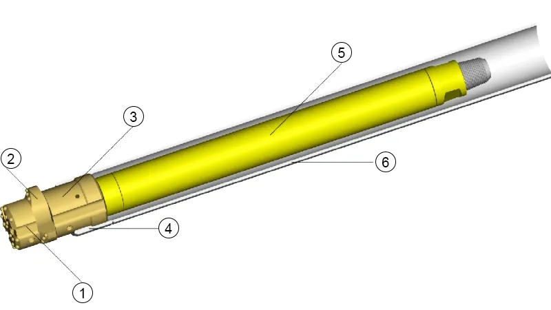 Un sistema de perforación con revestimiento excéntrico generalmente está compuesto por de un martillo DTH, un conjunto de perforación con revestimiento excéntrico, una zapata de revestimiento y el revestimiento. El conjunto de perforación excéntrico suele estar integrado por una broca piloto, una broca de escariado excéntrica, un centralizador y un mecanismo de bloqueo/desbloqueo.